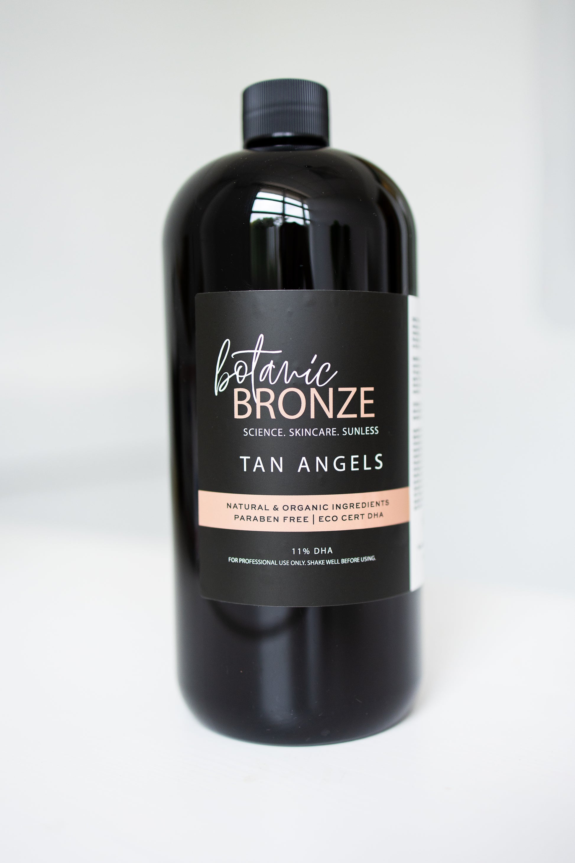 Tan Angels Original is a deep olive hued solution that complements cool toned clients. This is an HD “camera ready” solution, making it a great option for photoshoots + other highlighted events. The greenish brown notes counteract with added cosmetic bronzer + DHA to prevent fair/cool toned clients from appearing orange. It offers a deep tan without the risk of that infamous rusty, overdeveloped look. As an 11% DHA strength, it falls in the medium-dark color range. This is a signature solution, so it is advised to leave on for 8-10 hours/overnight before rinsing.